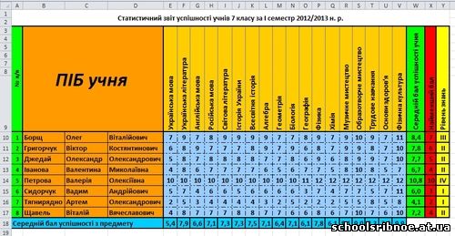 1. Відкрийте файл Успішність.xlsx та збережіть його . За даними таблиці Навчальні досягнення учнів обчисли значення середнього балу успішності кожного учня й середній бал успішності всіх учнів із кожного предмета.